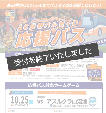 【受付終了】2025年10月25日(土) 【2025明治安田生命J3リーグ 第33節】ホームゲーム AC長野パルセイロvsアスルクラロ沼津 オフィシャルバスツアー 2025年10月9日 詳しくはこちら »