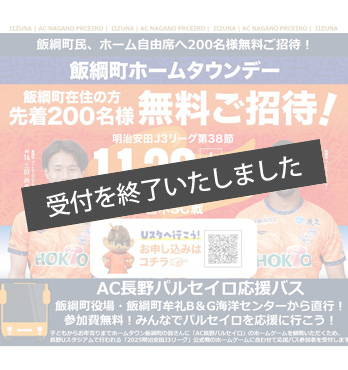 【受付終了】2025年10月25日(土) 【2025明治安田生命J3リーグ 第33節】ホームゲーム AC長野パルセイロvsアスルクラロ沼津 オフィシャルバスツアー 2025年10月9日 詳しくはこちら »